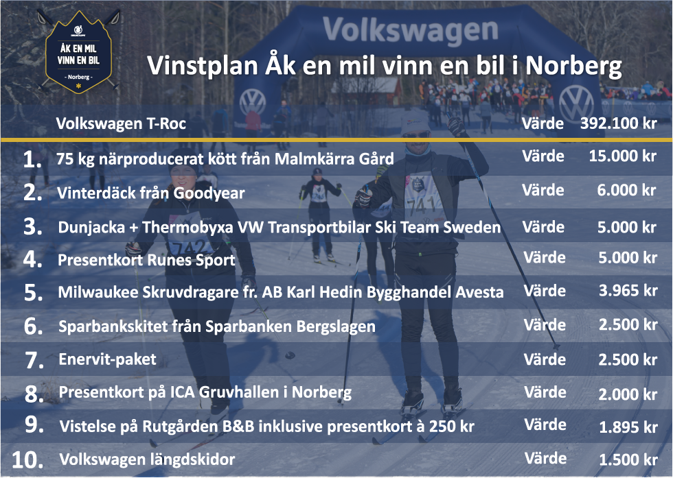 Var med och upplev folkfesten både i spåret och på Torget i Norberg lördag den 31 januari. Åk en mil vinn en bil är loppet utan tidtagning med start och mål på Torget. Njut av den fina och lättåkta banan. Du kan åka själv, med familjen eller kompisgänget. Efter målgång kan du bl.a. se morgondagens skidstjärnor åka i Lilla Engelbrektsloppet eller träffa våra partners som bjuder på trevliga aktiviteter inför den spännande prisutdelningen. Kanske blir det just du som åker hem i en helt ny Volkswagen T-Roc!? Alla som deltar har lika stor chans att vinna.